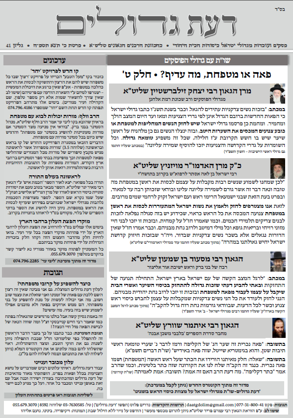 עלון דעת גדולים מס' 41, פסקים ועובדות מגדולי ישראל ביסודות הבית היהודי גליונות נוספים של דעת גדולים לחץ כאן השבוע בגליון: פסקי הגדולים: פאה או מטפחת, מה עדיף? חלק ט' ובו מובאים דברי מרנן ורבנן שליט"א: כ"ק האדמו"ר מויזניץ , הגאון רבי יצחק זילברשטיין, הגאון רבי מסעוד בן שמעון, הגאון רבי איתמר שוורץ עדכונים: באיזה סמינר מורות רשאיות לבוא עם … המשך לקרוא גליון דעת גדולים 41 פרשת כי תצא תשפה – פסקים ועובדות מגדולי ישראל ביסודות הבית היהודי