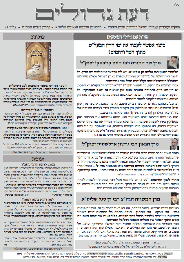 גליון דעת גדולים 43 פרשת ניצבים תשפה – פסקים ועובדות מגדולי ישראל ביסודות הבית היהודי