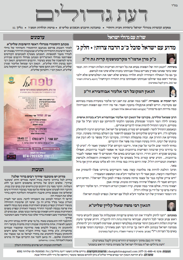 גליון דעת גדולים 51 פרשת תולדות תשפו – פסקים ועובדות מגדולי ישראל ביסודות הבית היהודי