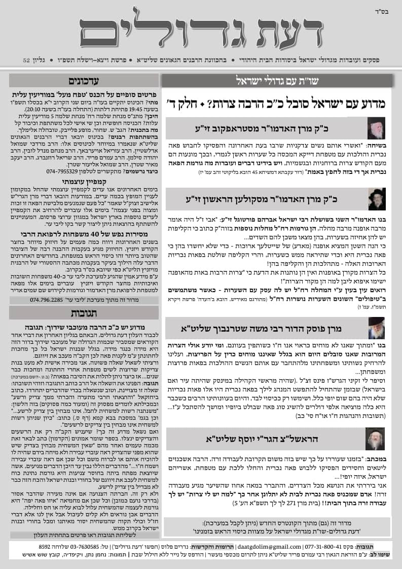 גליון דעת גדולים 52 פרשת ויצא-וישלח תשפו – פסקים ועובדות מגדולי ישראל ביסודות הבית היהודי