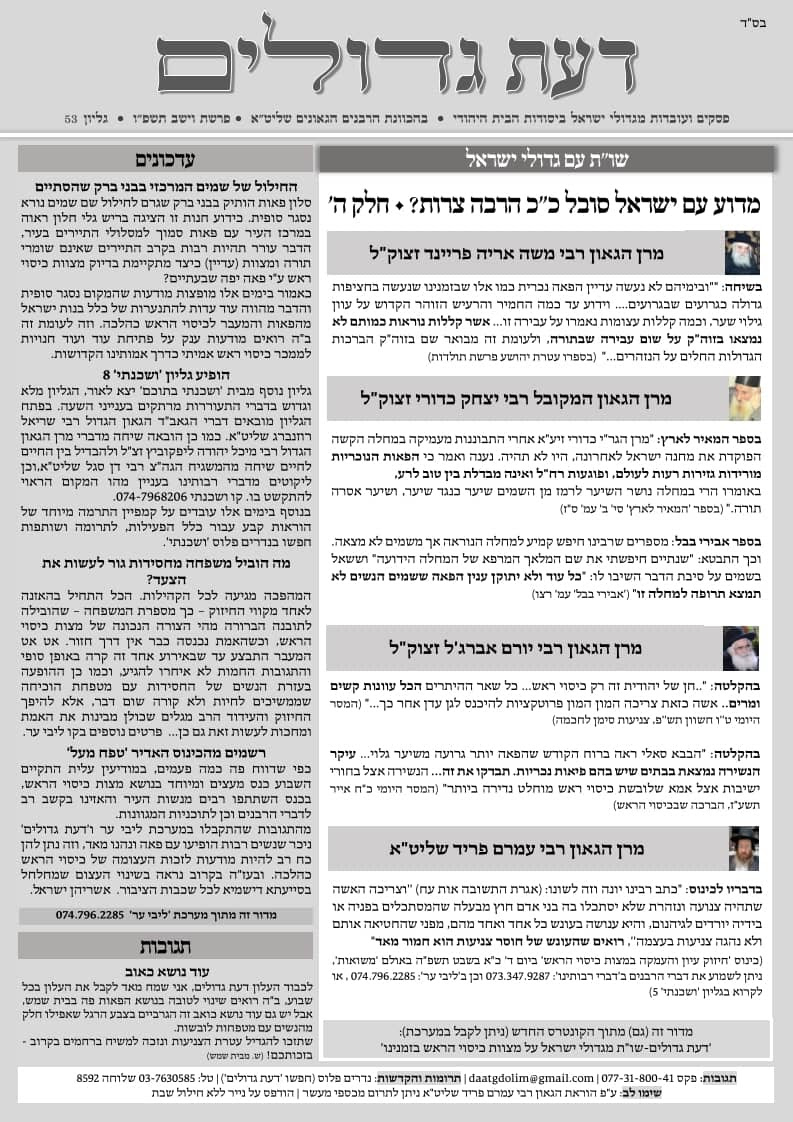 גליון דעת גדולים 53 פרשת וישב תשפו – פסקים ועובדות מגדולי ישראל ביסודות הבית היהודי